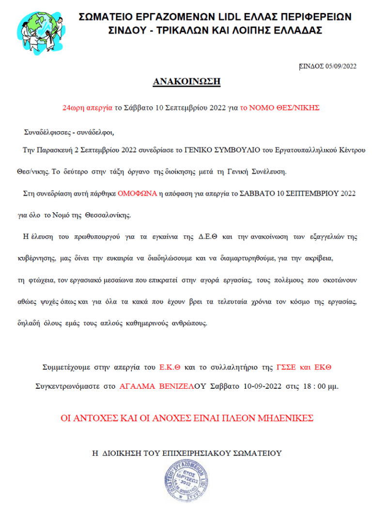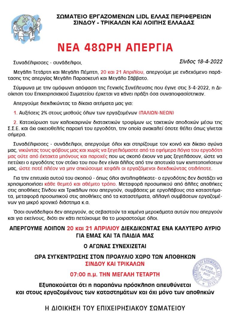 Δημήτρης Τσίρκας: Απεργία εργαζομένων Lidl Ελλάς 20-21/04