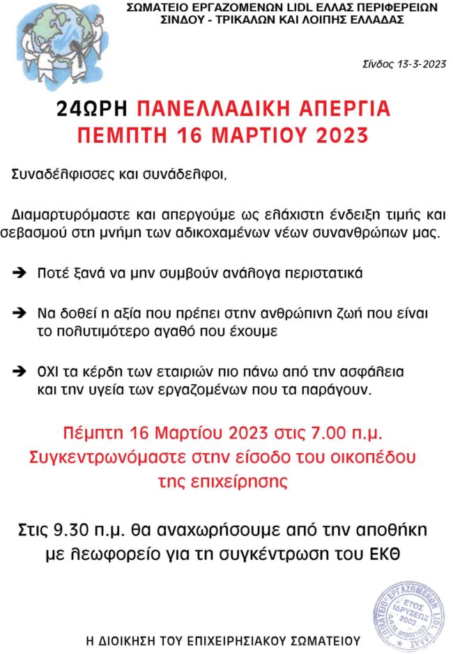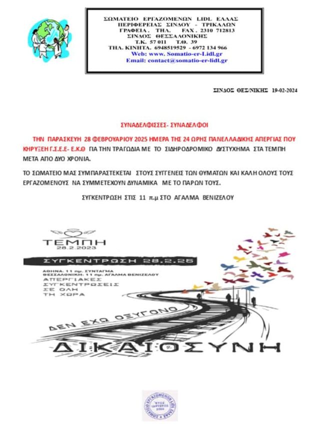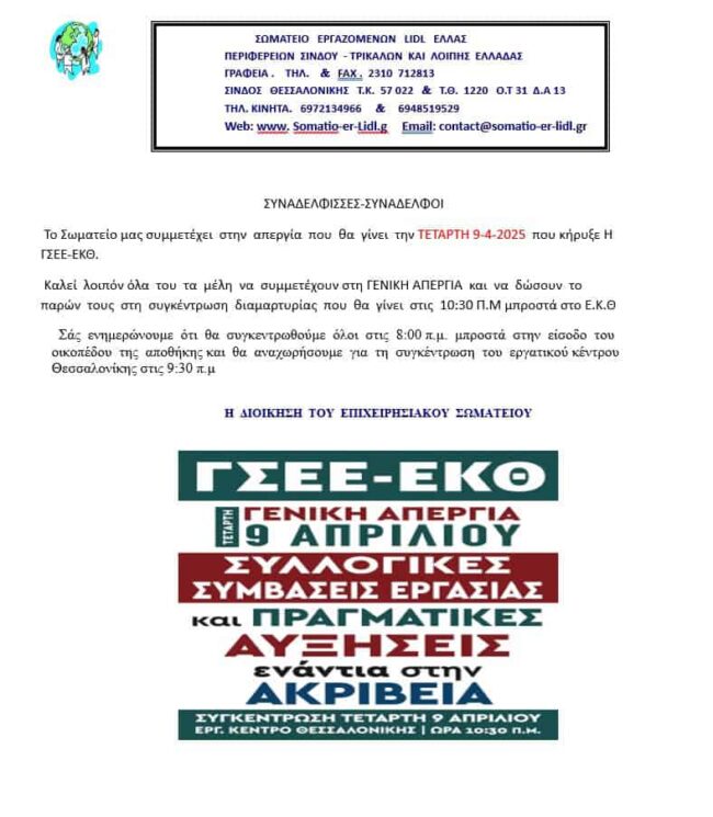 ΣΥΝΑΔΕΛΦΙΣΣΕΣ-ΣΥΝΑΔΕΛΦΟΙ ΤΗΝ ΤΕΤΑΡΤΗ 17 ΑΠΡΙΛΙΟΥ 2024 ΗΜΕΡΑ ΤΗΣ ΓΕΝΙΚΗΣ ΑΠΕΡΓΙΑΣ ΠΟΥ ΚΗΡΥΞΕ Η Γ.Σ.Ε.Ε – Ε.Κ.Θ . ΣΑΣ ΕΝΗΜΕΡΩΝΟΥΜΕ ΟΤΙ ΤΟ ΣΩΜΑΤΕΙΟ ΜΑΣ ΘΑ ΣΥΜΜΕΤΕΧΕΙ ΣΤΗΝ ΑΠΕΡΓΙΑ ΚΑΙ ΚΑΛΗ ΟΛΟΥΣ ΤΟΥΣ ΕΡΓΑΖΟΜΕΝΟΥΣ ΝΑ ΣΥΜΜΕΤΕΧΟΥΝ ΔΥΝΑΜΙΚΑ ΜΕ ΤΟ ΠΑΡΩΝ ΤΟΥΣ . ΘΑ ΣΥΓΚΕΝΤΡΩΘΟΥΜΕ ΟΛΟΙ ΣΤΙΣ 8:00 Π.Μ ΜΠΡΟΣΤΑ ΣΤΗ ΕΙΣΟΔΟ ΤΟΥ ΟΙΚΟΠΕΔΟΥ ΤΗΣ ΑΠΟΘΗΚΗΣ ΚΑΙ…