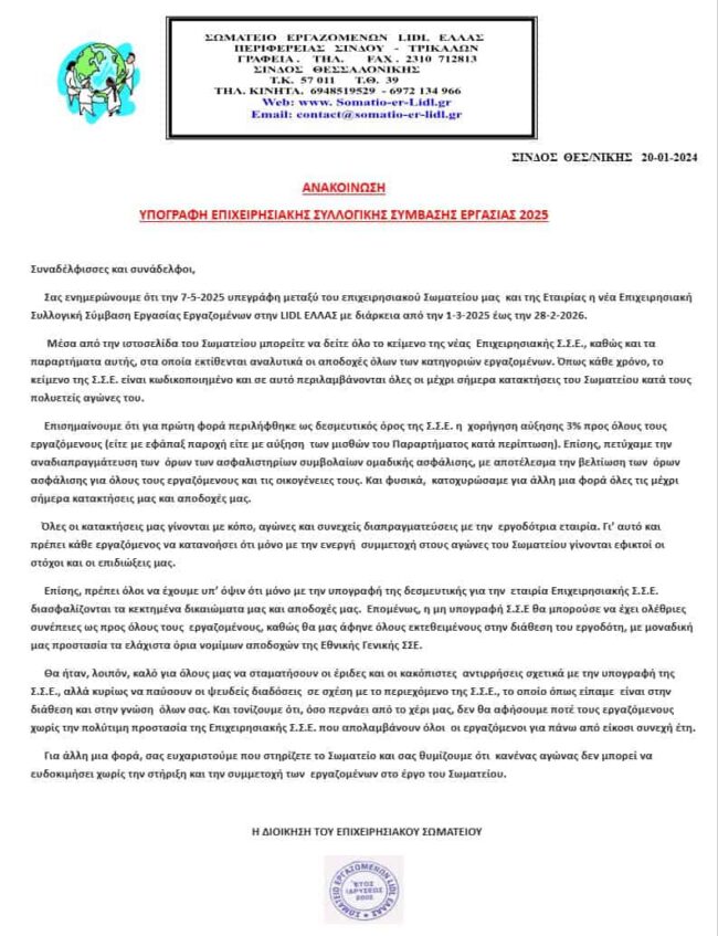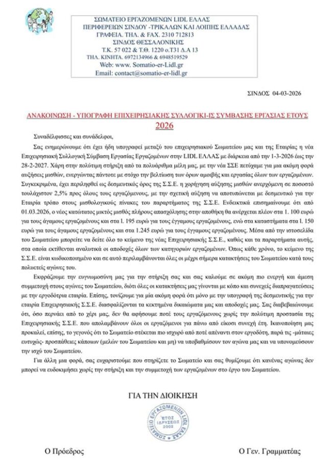 ΕΠΙΧΕΙΡΗΣΙΑΚΗ ΣΥΛΛΟΓΙΚΗ ΣΥΜΒΑΣΗ ΕΡΓΑΣΙΑΣ ΕΡΓΑΖΟΜΕΝΩΝ LIDL ΕΛΛΑΣ ΕΤΟΥΣ 2026